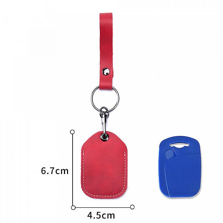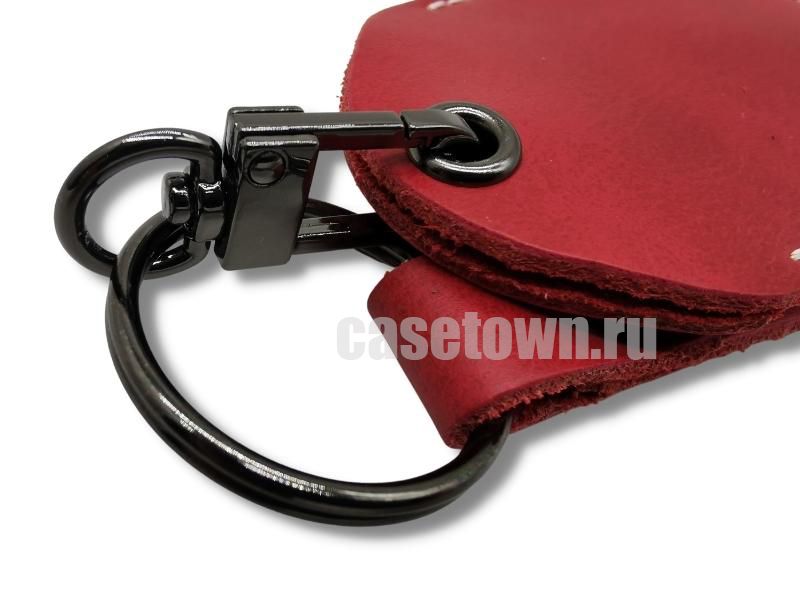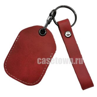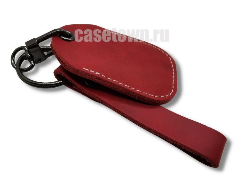 Кожаный чехол красного цвета для автомобильной метки сигнализации. Прошит белой ниткой по контуру. В комплекте к чехлу идёт брелок.