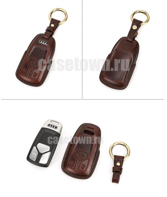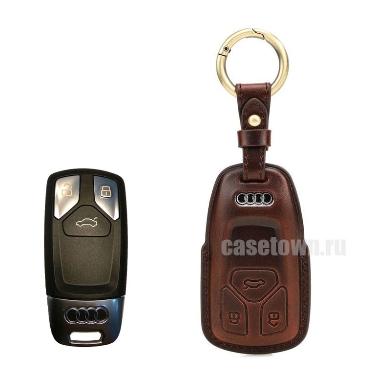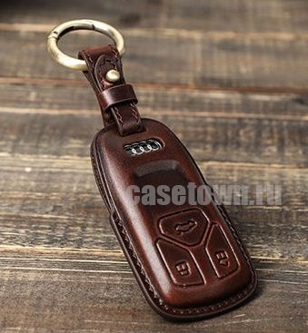 Чехол из натуральной тёмнокоричневой кожи для смарт ключа Ауди А4, А5, Q5, Q7, S5, SQ5, RS, TT с 2015 года. Ручная работа. Натуральная кожа выполненная в винтажном стиле. Качественная фурнитура. Вырубка на изделии для логотипа оригинального ключа Audi с лицевой стороны. Кольцо-карабин на брелке. Тиснение в виде кнопок. Качественный подарок для владельцев немецкой машины.