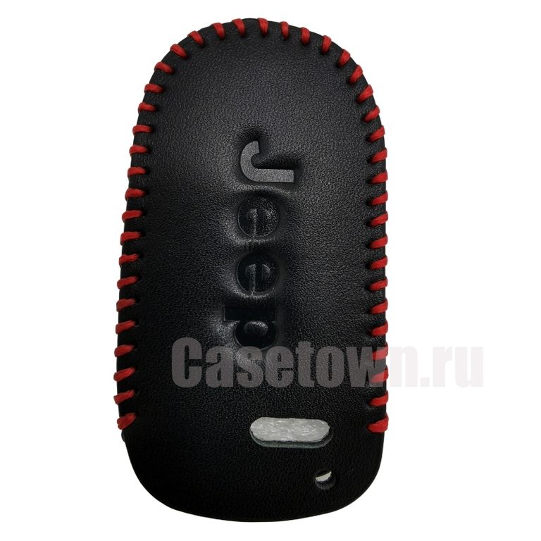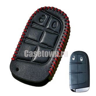 Чехол для 2-х кнопочного смарт ключа Джип Гранд Чероки. Материал аксессуара: тонкий верхний слой натуральной кожи + экокожа. По периметру прошит красной ниткой. Кнопки на изделии полностью совпадают с оригинальным ключом Jeep Grand Cherokee.