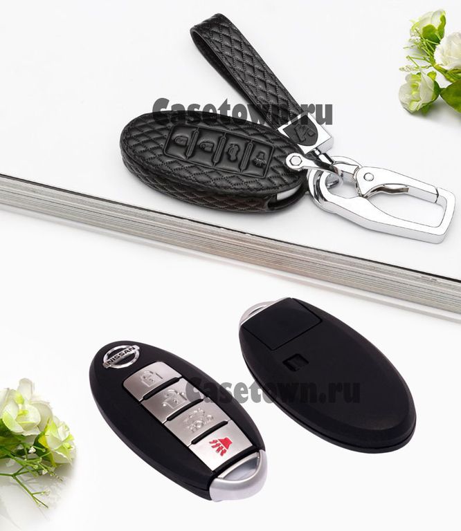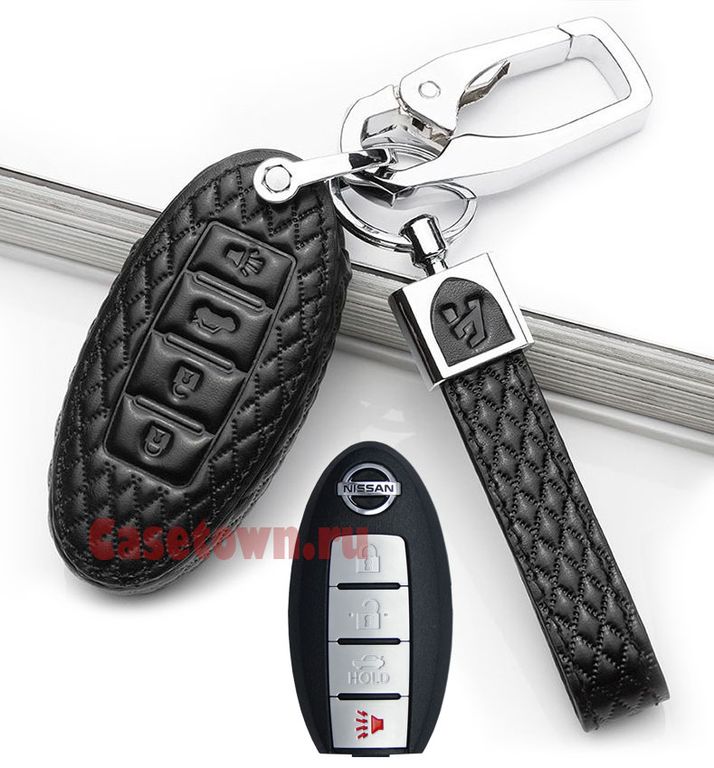 Чехол для 4-х кнопочного смарт ключа Nissan c 4-ой кнопкой "Panic". Натуральная чёрная кожа. Кожаный брелок идёт в наборе, а также дополнительно металлический брелок в виде карабина. Аксессуар подойдёт для электромобиля Nissan Leaf в 1 и 2 поколении, выпускаемых на японском и американском рынке. Если у Вас ключ такой же, как на картинке ниже, кожаный чехол из коллекции "King" Вам подойдёт.
