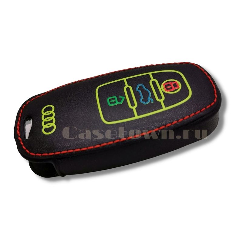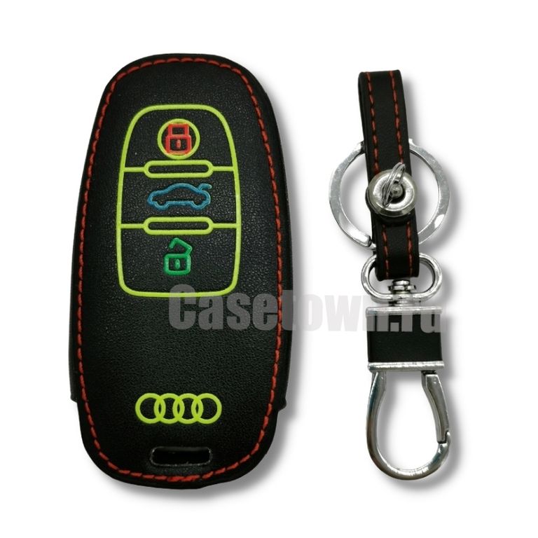 Кожаный чехол для смарт ключа Ауди А4, А5, А6, А7, А8 и Q5 в большинстве с 2008 по 2018 год выпуска. Качественное изделие, прошитое красной ниткой по периметру аксессуара. Чехольчик рассчитан для ключей с 3 кнопками, как на фотке ниже. Неоновые кнопки светятся в темноте. Идёт в комлекте с брелком. Коллекция "Neon"