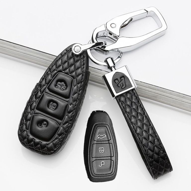 Чехол из натуральной кожи чёрного цвета на смарт ключ Форд Фокус 3. Совместимость с 3-х кнопочным пультом. Кожаный брелок с дополнительным карабином в комплекте. Коллекция "King".