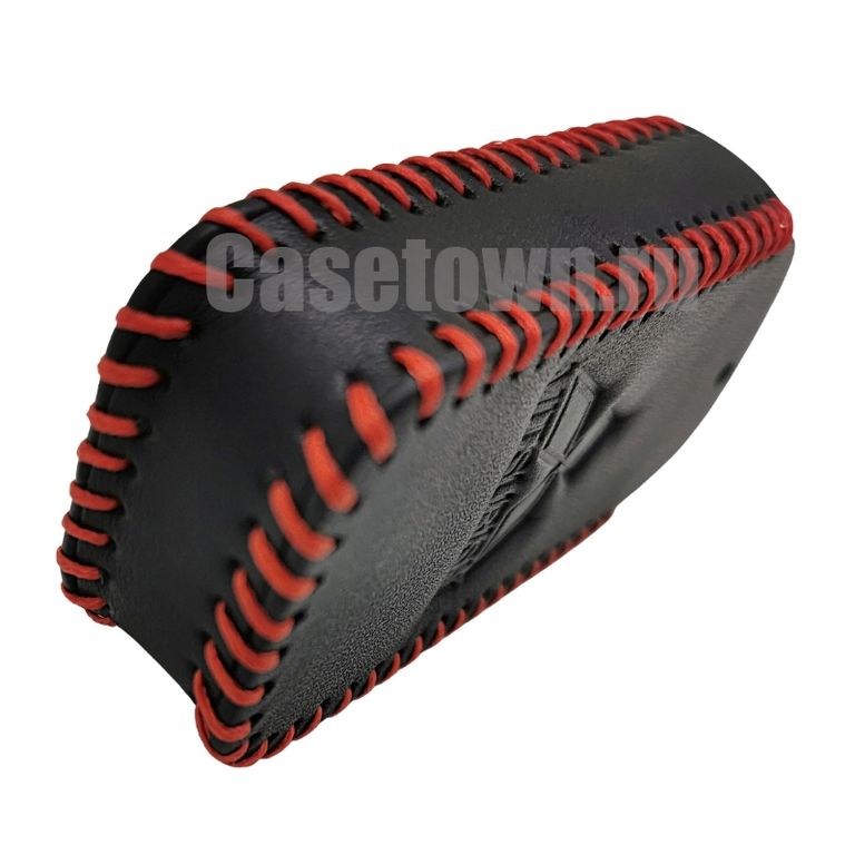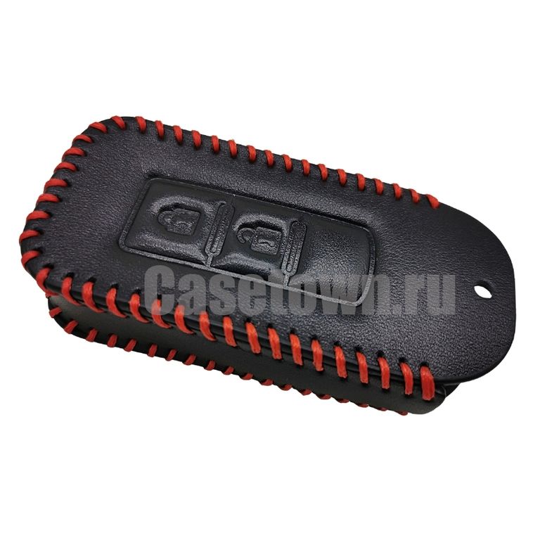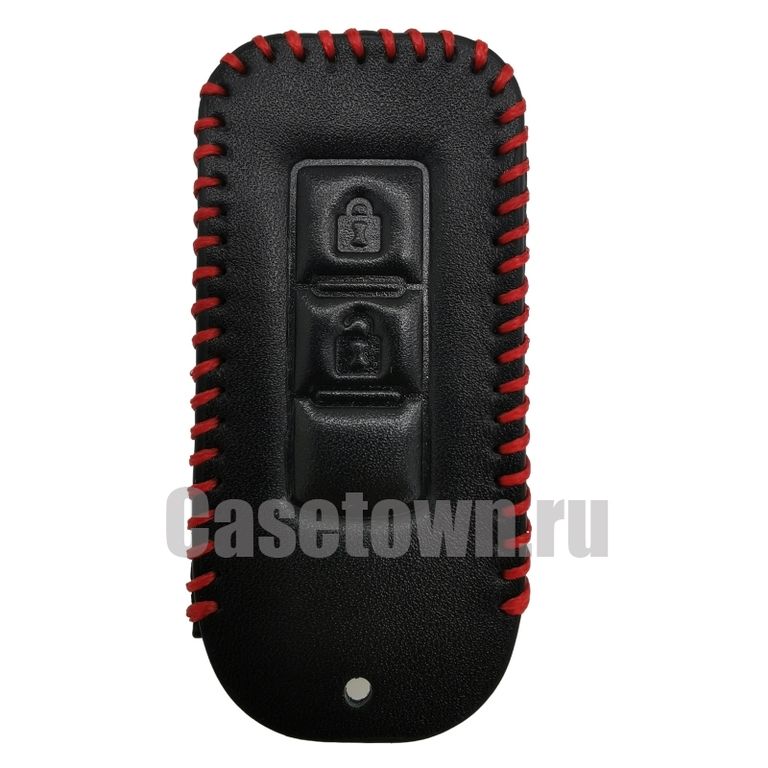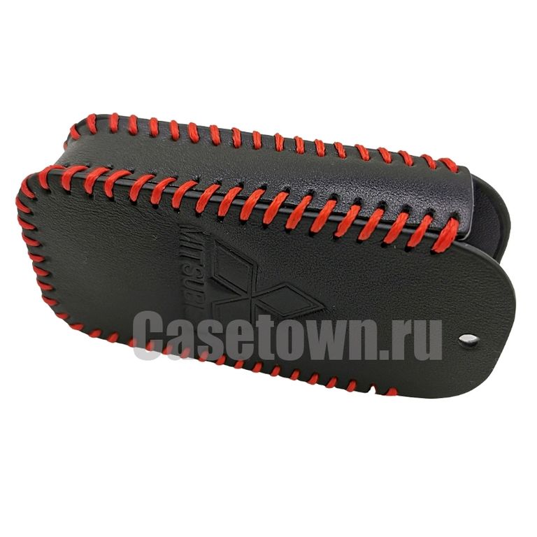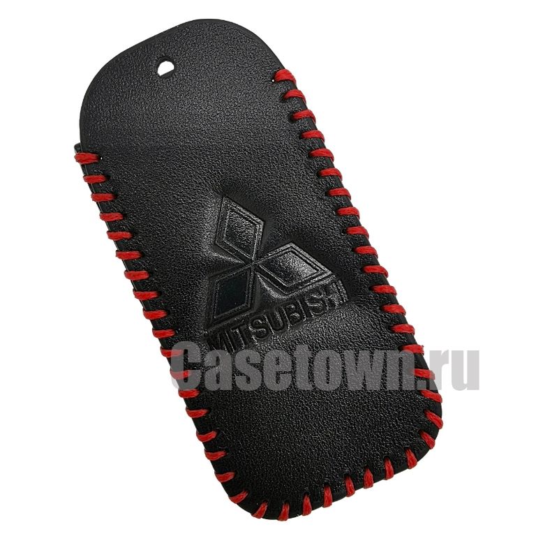 Чёрный чехол с красной прострочкой на автомобильным смарт ключ Митсубиси с 2 кнопками. Идеально защитит от падения, повреждений и царапин на ключе. Сзади изображен логотип "Mitsubishi".