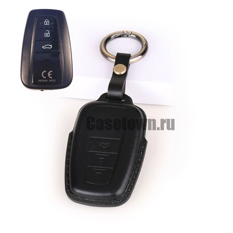 Изделие выполнено специльно для 3-х кнопочного автомобильного ключа Тойота последний поколений, приближённых к 2020 году. Качественная фурнитура в виде кольца карабина.