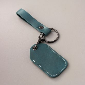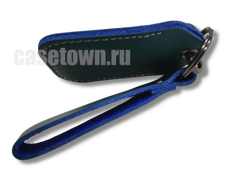 Чехол из кожи оливкового цвета для автомобильной метки сигнализации. Прошит белой ниткой по контуру. В комплекте к чехлу идёт кожаный ремешок для фиксации чехла.