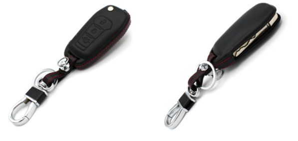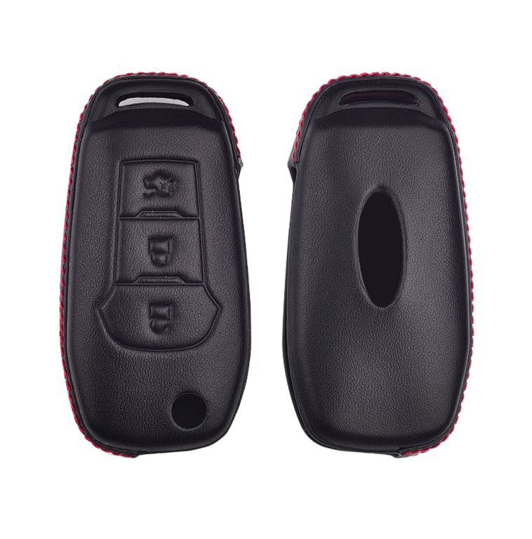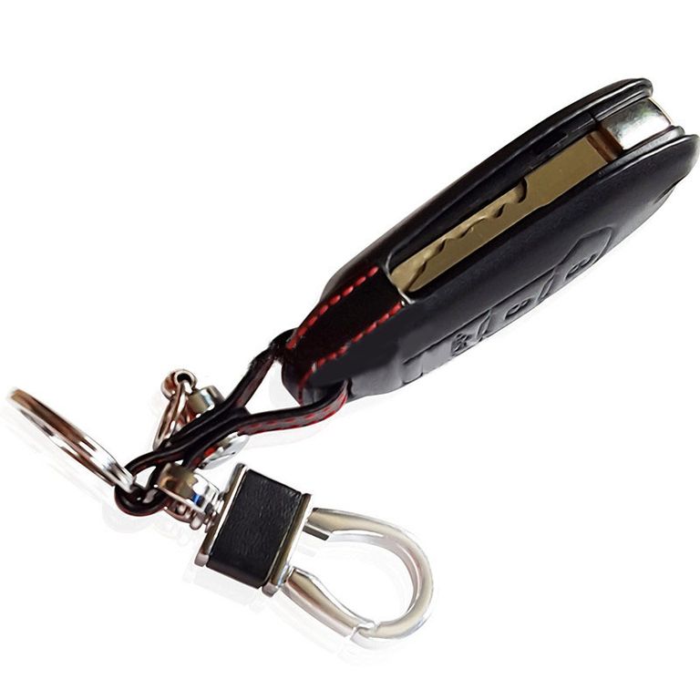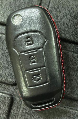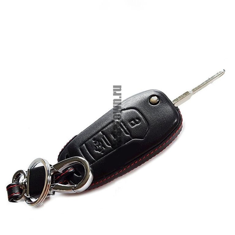 Кожаный чехол для оригинального выкидного ключа Ford Mondeo 5 поколения с 2014 года с 3 кнопками на пульте. Приятный материал. Прострочка по контуру изделия красной ниткой. Кожаный брелок с металлическим карабином идёт в комплекте.