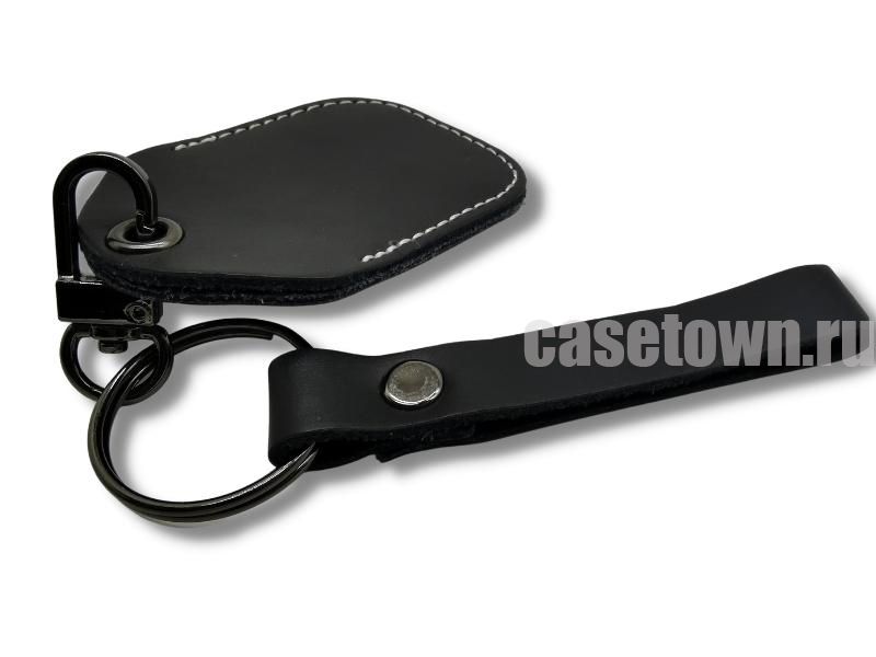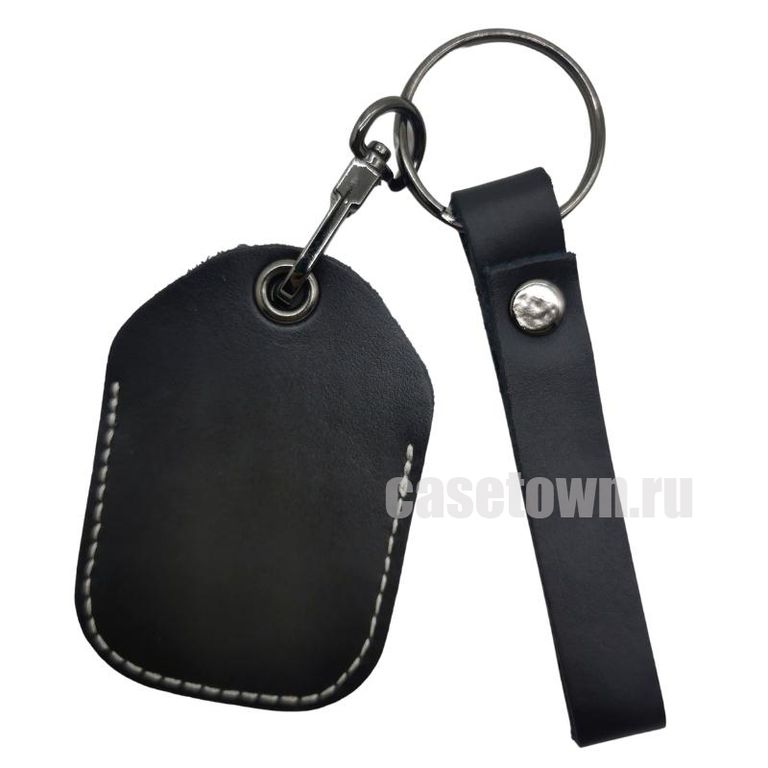 Кожаный чехол черного цвета для автомобильной метки сигнализации. Прошит белой ниткой по контуру. В комплекте к чехлу идёт брелок.