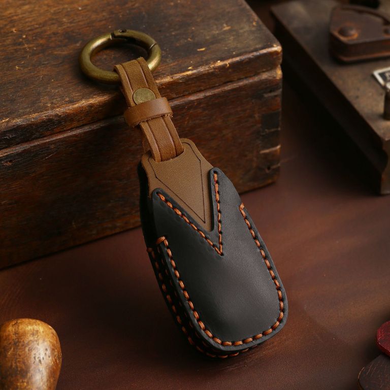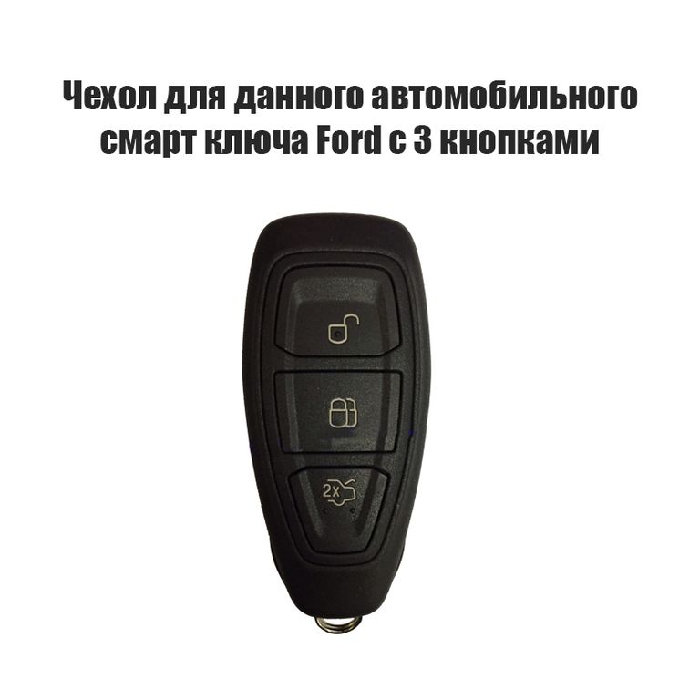 Чехол из натуральной кожи чёрного цвета на смарт ключ Форд Фокус 3, Мондео 4, Куга. Совместимость с 3-х кнопочным смарт пультом, автомобиль который заводится с кнопки старт стоп. Кожаный коричневый хлястик брелок с дополнительным кольцом карабином в комплекте.