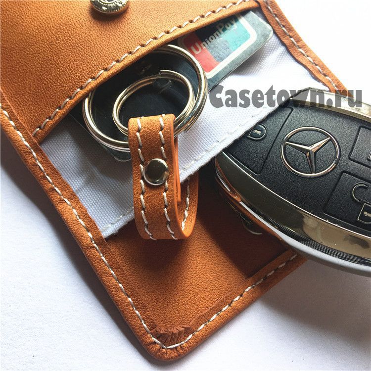 Экранированный чехол из натуральной кожи (КРС) для смарт ключей автомобиля обезопасит водителя от угона машины. По контуру изделие прошито прочной вощёной ниткой. Цвет аксессуара: коричневый. Защёлкивается чехол на кнопку.Вспомогательный ремешок с карабином для ключа вшит внутрь изделия.