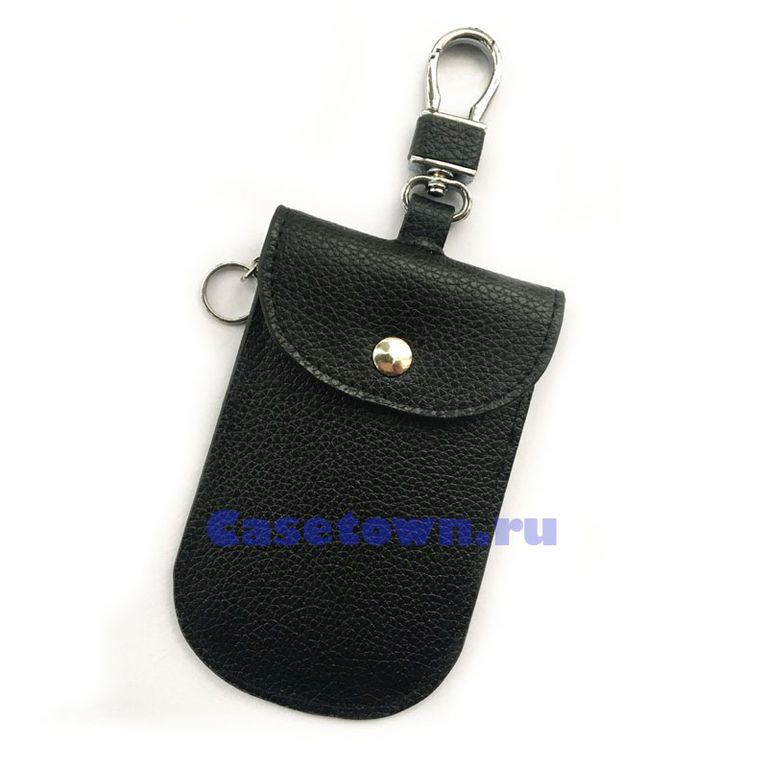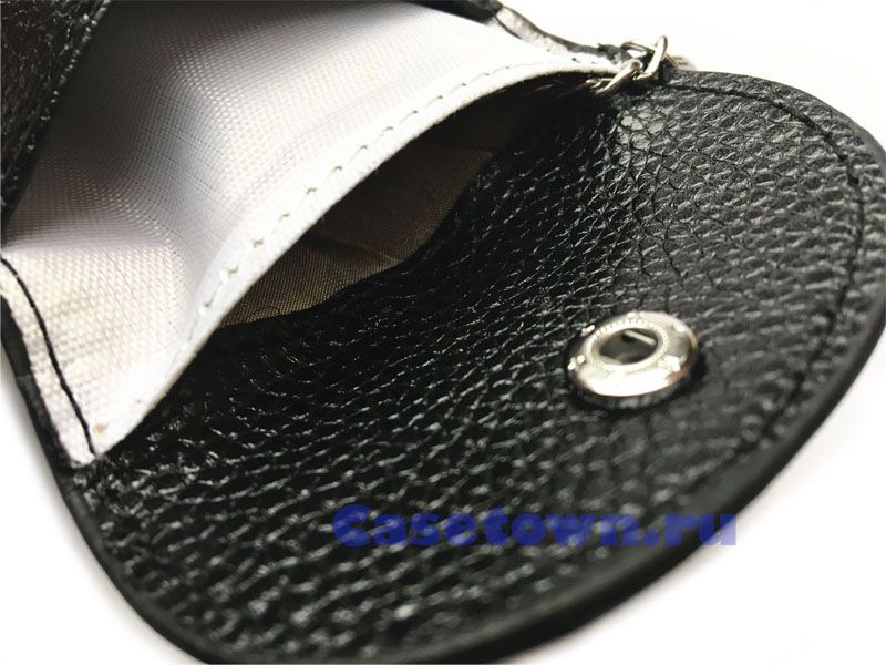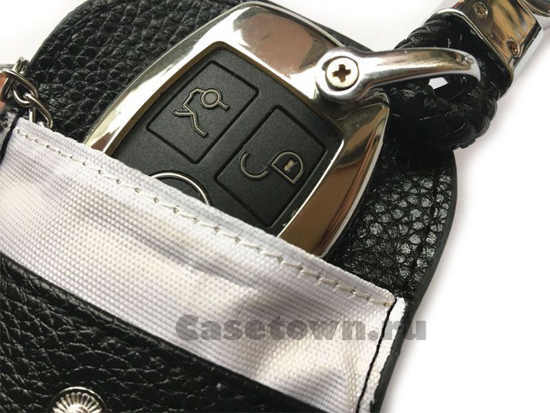 Экранирующий чехол для автомобильного смарт ключа. Натуральная кожа чёрного цвета. Приятно держать в руке. Совместим со многими ключами автомобиля, в которых есть бесключевой доступ в машину. Стильный вид и первоклассная защита сетки фарадея внутри не даст перехватить сигнал автоугонщикам.