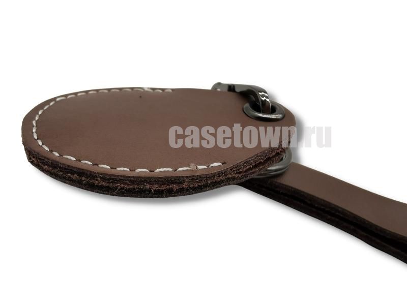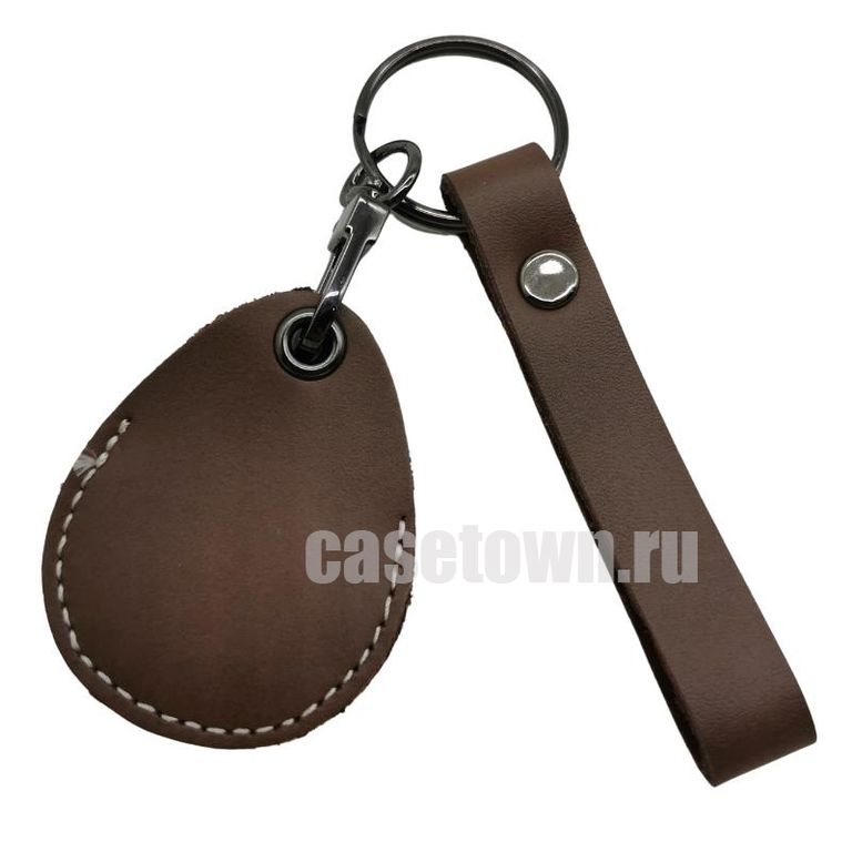 Кожаный чехол коричневого цвета для магнитной квартирной метки (ключа) от домофона. Прошит белой ниткой по контуру. В комплекте к чехлу идёт брелок в виде ремешка.