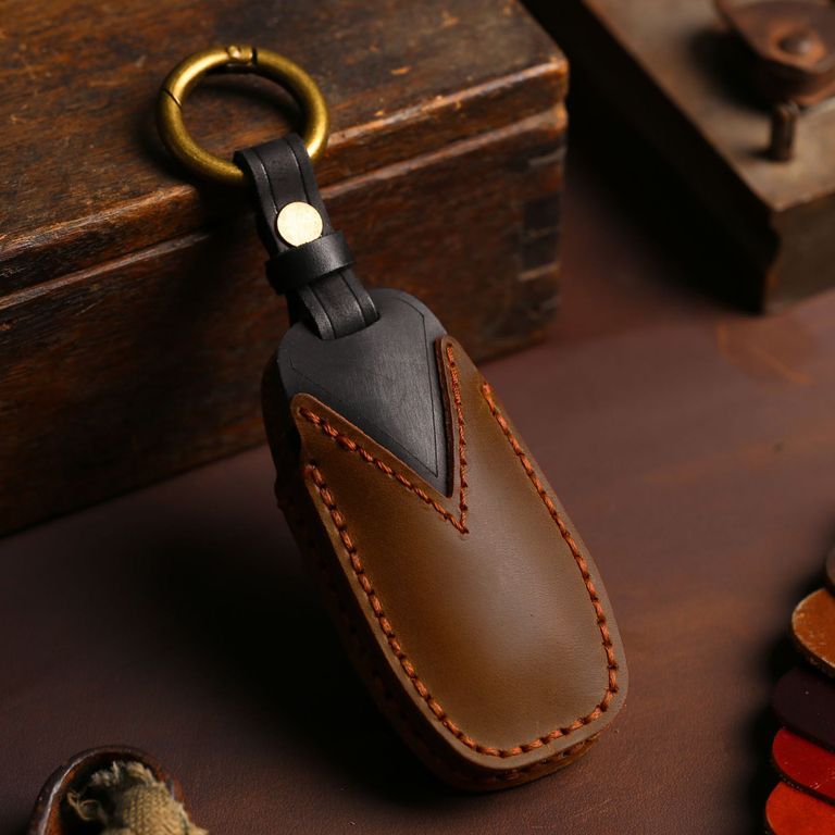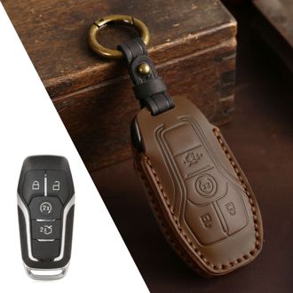 Чехол для оригинального смарт ключа Форд Мондео 5 поколения и Форд Эксплорер 5 рестайлинг с 4 кнопками на лицевой части брелка. Натуральная тёмная коричневая кожа. Сзади изделия чёрная вставка из кожи. Ручной двойной шов светлой коричневой ниткой. Сдерживает ключ в чехле коричневый чёрный с кольцом карабином. Красивая упаковка. Идеально подойдёт в качестве подарка для владельца автомобиля Форд. Не более 30 секунд уйдёт на вставить/вытащить ключ. Сигнал не блокируется при использовании.