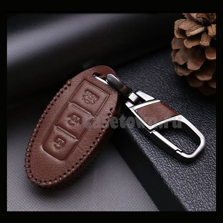 Коричневый чехол для защиты смарт ключа Nissan с 3 кнопками. Качественная экокожа. Логотип автомобиля Nissan на задней стороне аксессуара. Совместим с оригинальным ключом Ниссан х треил т32, Сентра и Теана. Полный список смотрите ниже. В комплекте к чехлу идёт брелок с металлиеским карабином.