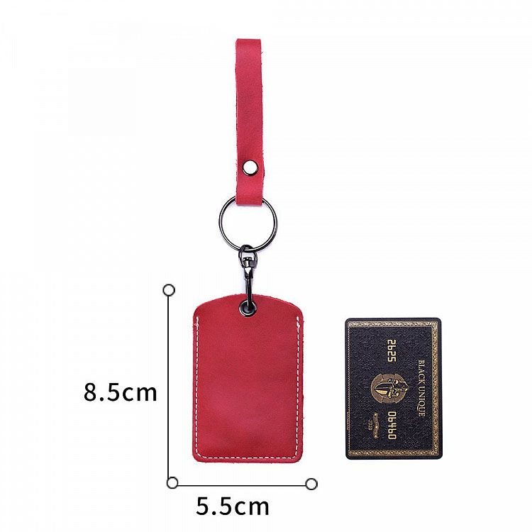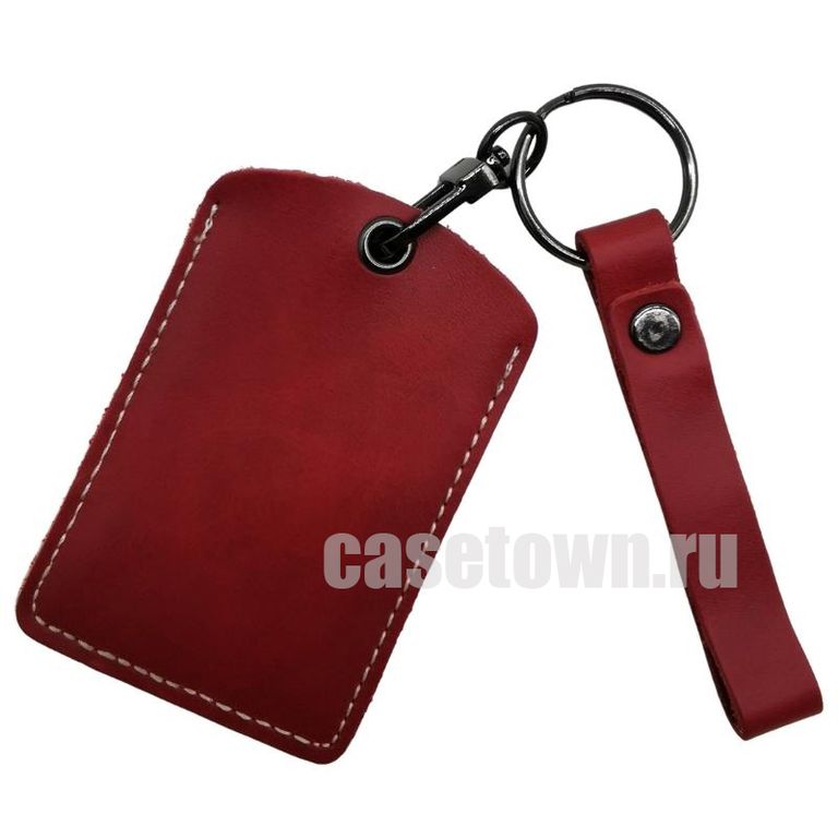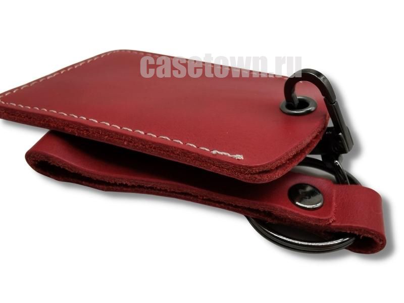 Чехол из кожи красного цвета для автомобильной метки сигнализации. Прошит белой ниткой по контуру. В комплекте к чехлу идёт кожаный ремешок для фиксации чехла.