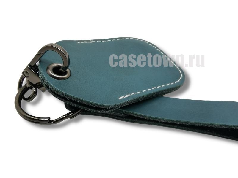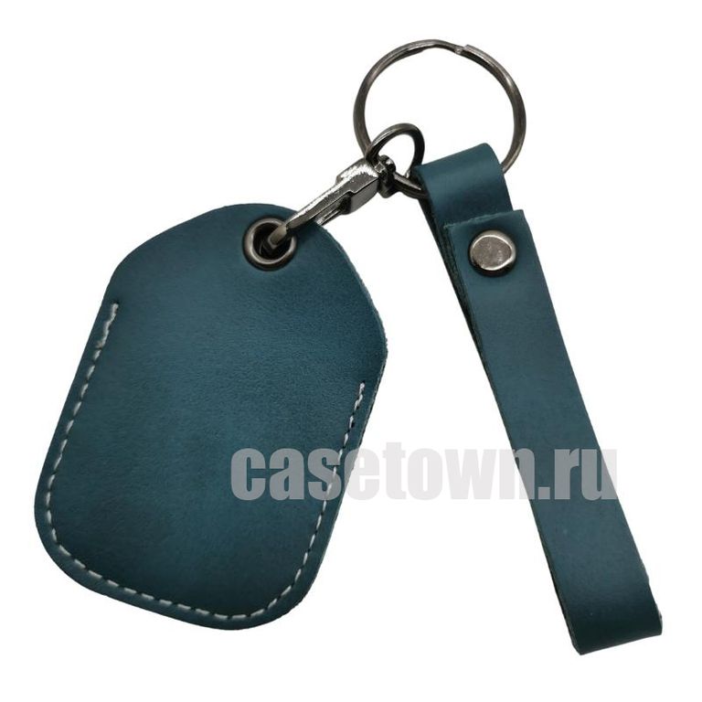 Кожаный чехол цвета тёмный циан (синий) для автомобильной метки сигнализации. Прошит белой ниткой по контуру. В комплекте к чехлу идёт брелок.