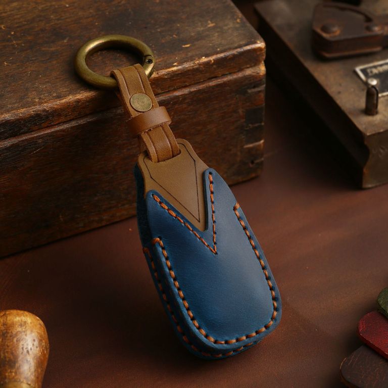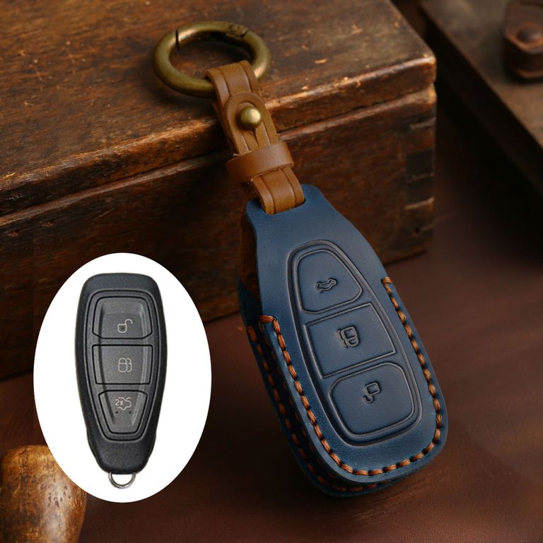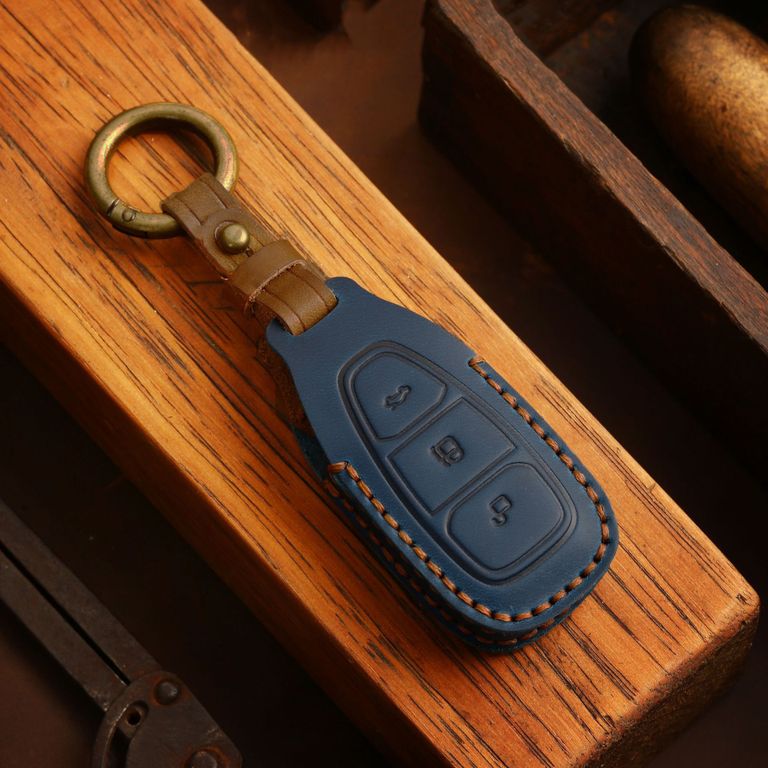 Чехол из натуральной кожи тёмного синего цвета на смарт ключ Форд Фокус 3, Мондео 4, Куга. Совместимость с 3-х кнопочным смарт пультом, автомобиль который заводится с кнопки старт/стоп. Кожаный коричневый хлястик брелок с дополнительным кольцом карабином в комплекте. Сзади чехла вшита коричневая треугольная вставка из кожи.