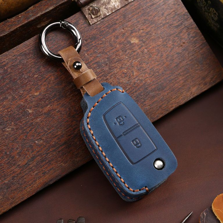 Чехол синего цвета для выкидного автомобильного ключа Ниссан Кашкай джей 11, Микра, Жук и других моделей авто Nissan с выкидным ключом на 2 кнопки. Натуральная кожа! Ручной шов вощеной ниткой. Фурнитура в виде кольца карабина. Качественное изделие будет защищать Ваш ключ от зацапин, потёртостей и поломки корпуса ключа.