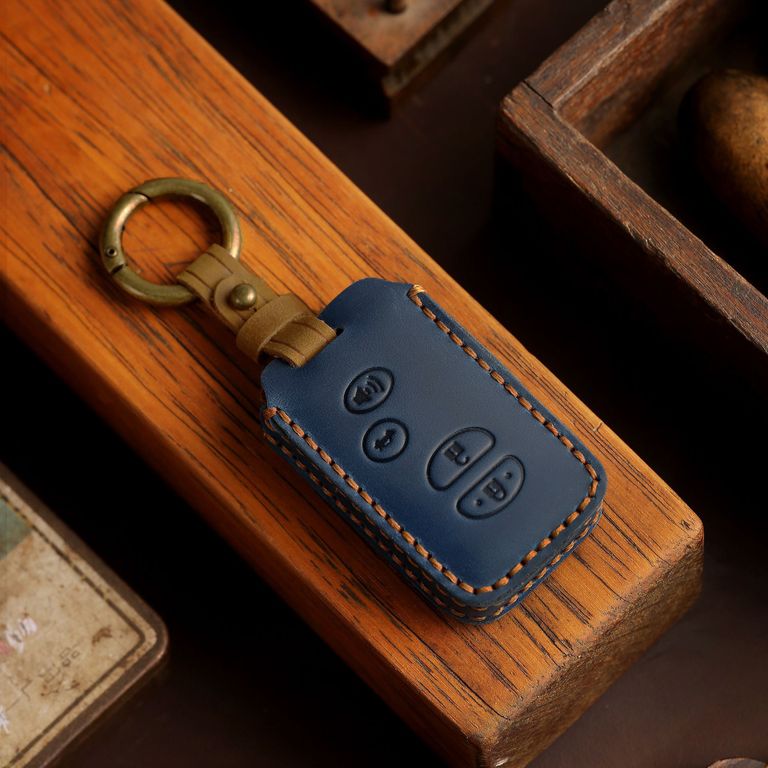 Чехол для автомобильного смарт ключа Тойота с 4 кнопками. Изделие из натуральной кожи тёмного синего цвета. Сзади вшита кожаная коричневая вставка. Кнопки на чехле хорошо прожимаются. Ручной шов коричневой ниткой. Вставить и вытащить ключ из чехла займёт не больше 30 секунд. Сдерживает ключ в чехле кожаный хлястик с кольцом карабином. Изделие совместимо с 2, 3 кнопочным ключом Тойота.