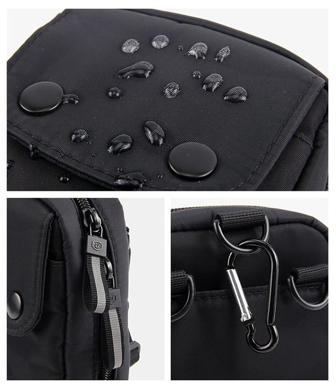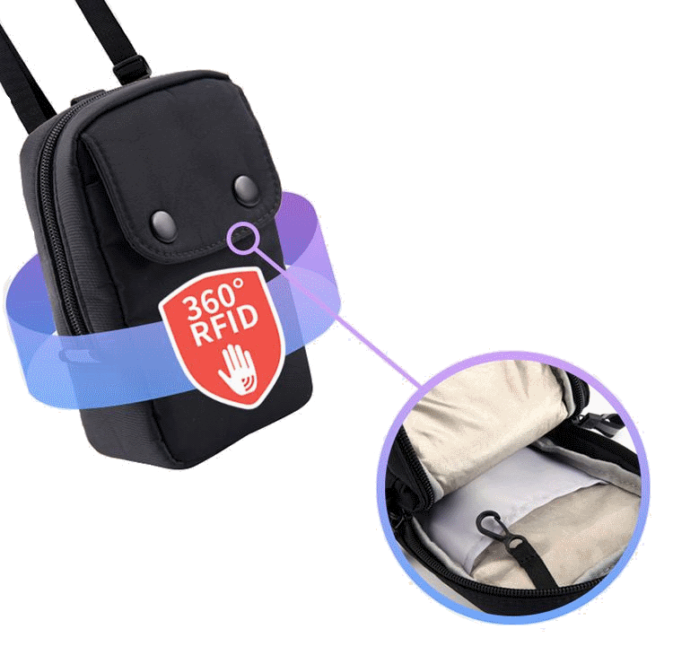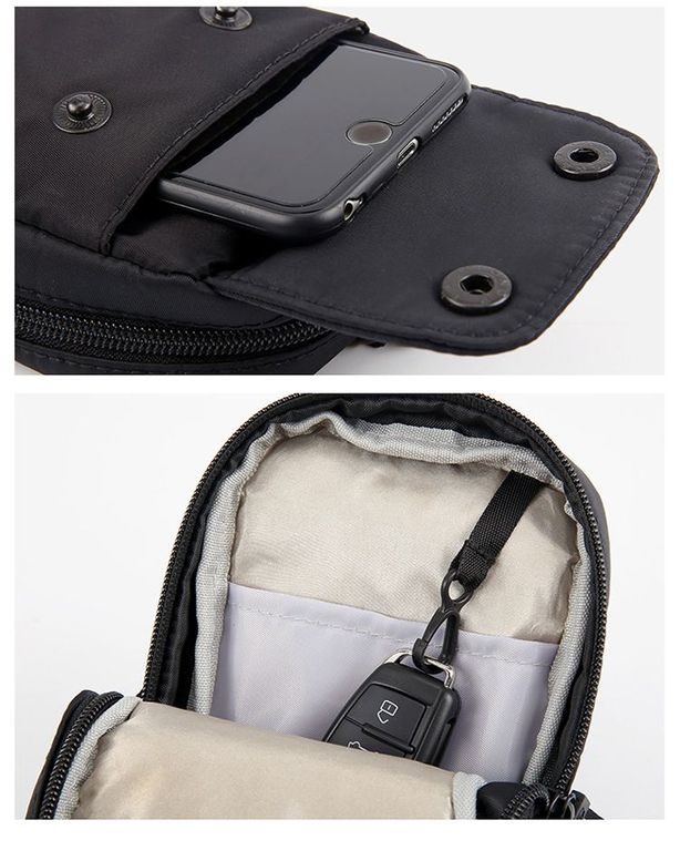 Туристическая сумка для документов чёрного цвета для поездок за границу, на работу или просто для прогулок. Идеально подойдёт, чтобы положить всё самое необходимое: телефон, паспорт, документы и автомобильный ключ. Благодаря сетки Фарадея, вшитую внутри изделия, сумка защищает от сканирования банковских карт. Тем самым стоя в очереди в магазине или в общественном транспорте у Вас никак не смогут снять деньги. Ткань водонепроницаемая. В комплекте также идёт карабин, чтобы повесить за джинсы, и ремень через плечо.