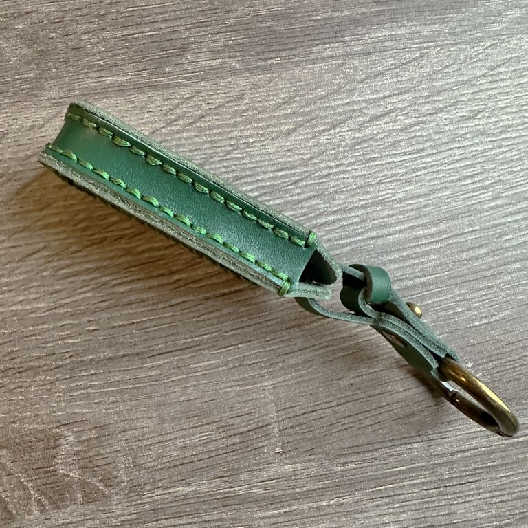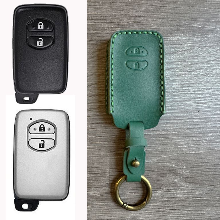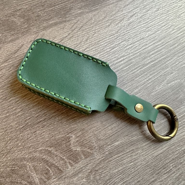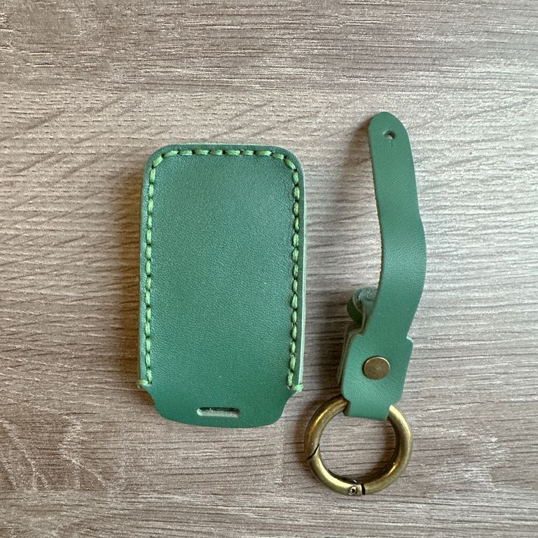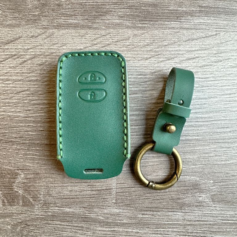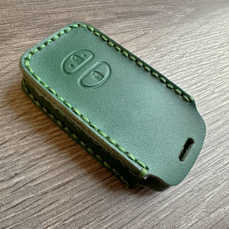 Кожаный зелёный чехол для автомобильного смарт ключа Тойота с 2 кнопками с 2008 года выпуска. Прострочка двойным швом зелёной ниткой. Кнопки на чехле полностью кликабельны и хорошо прожимаемы. Ключ в чехол легко вставить и вытащить при необходимости.